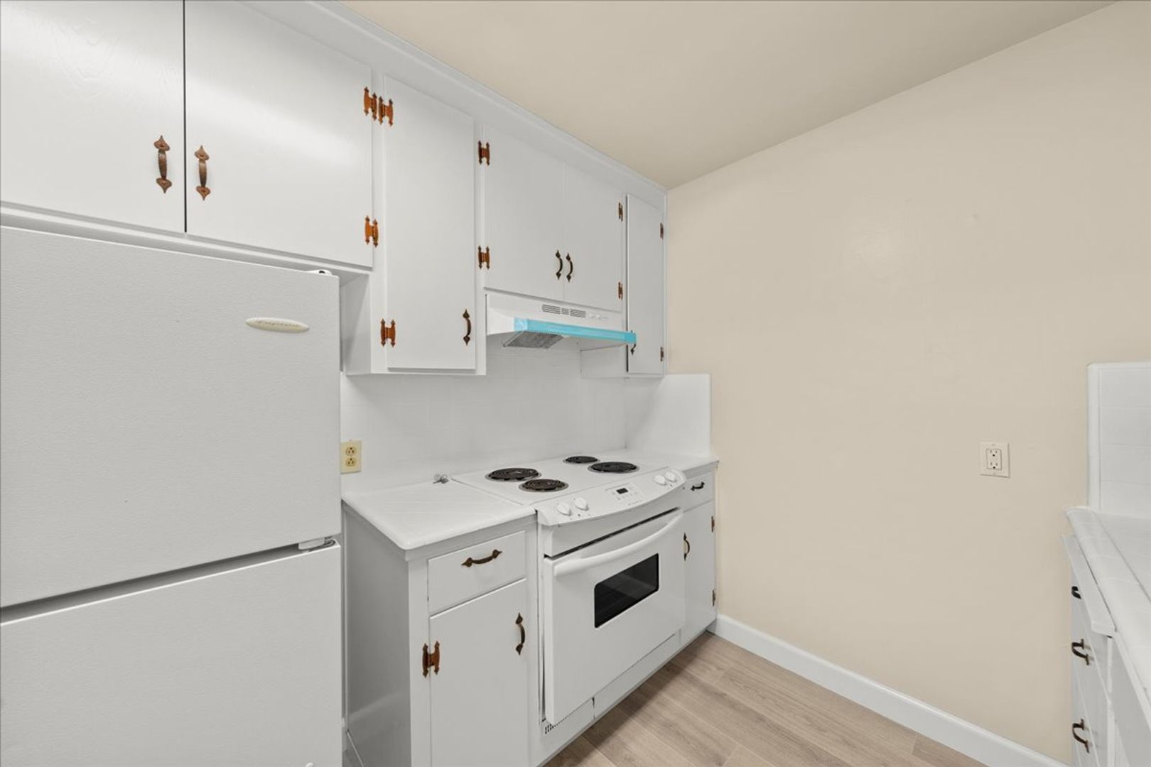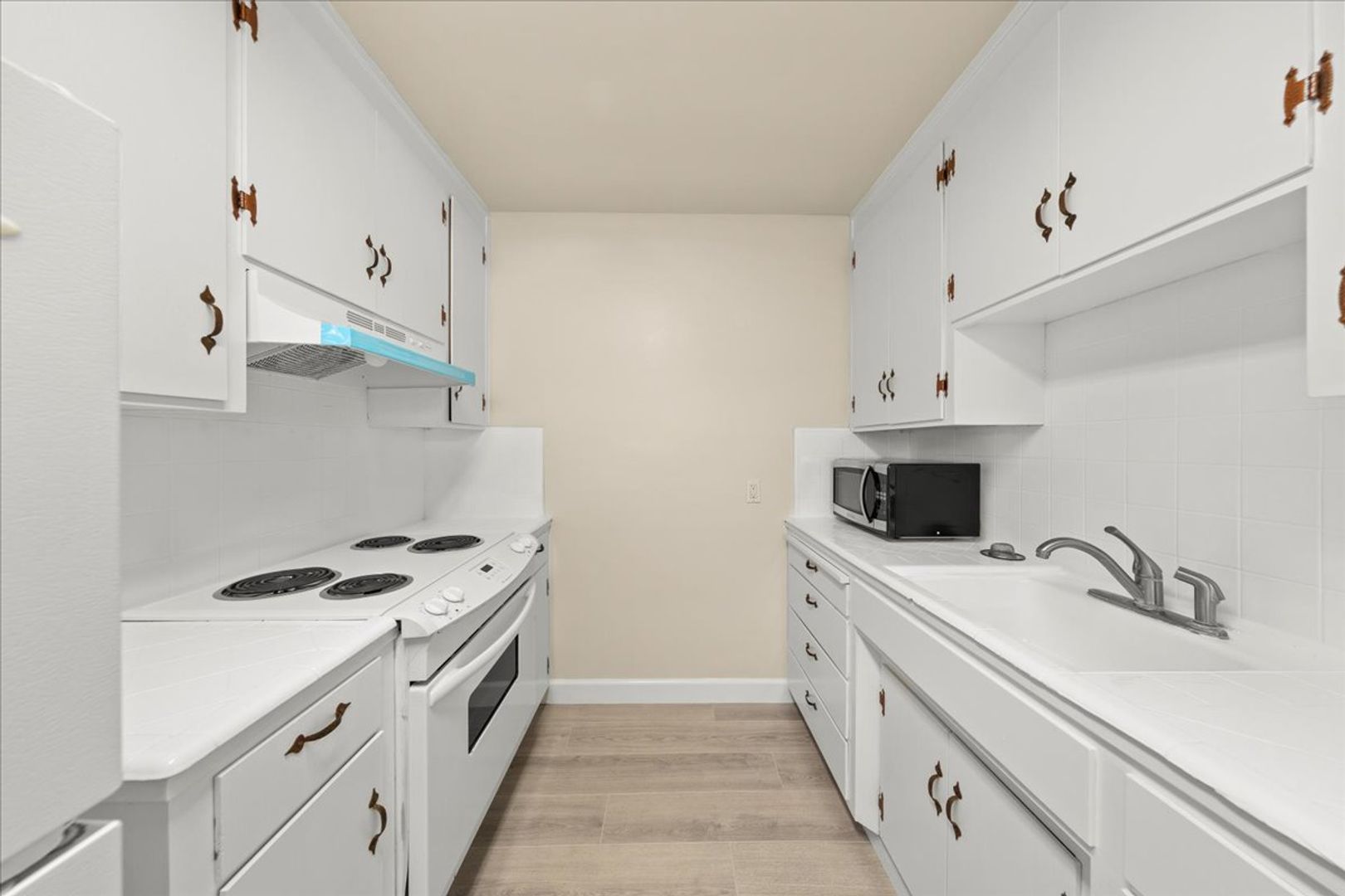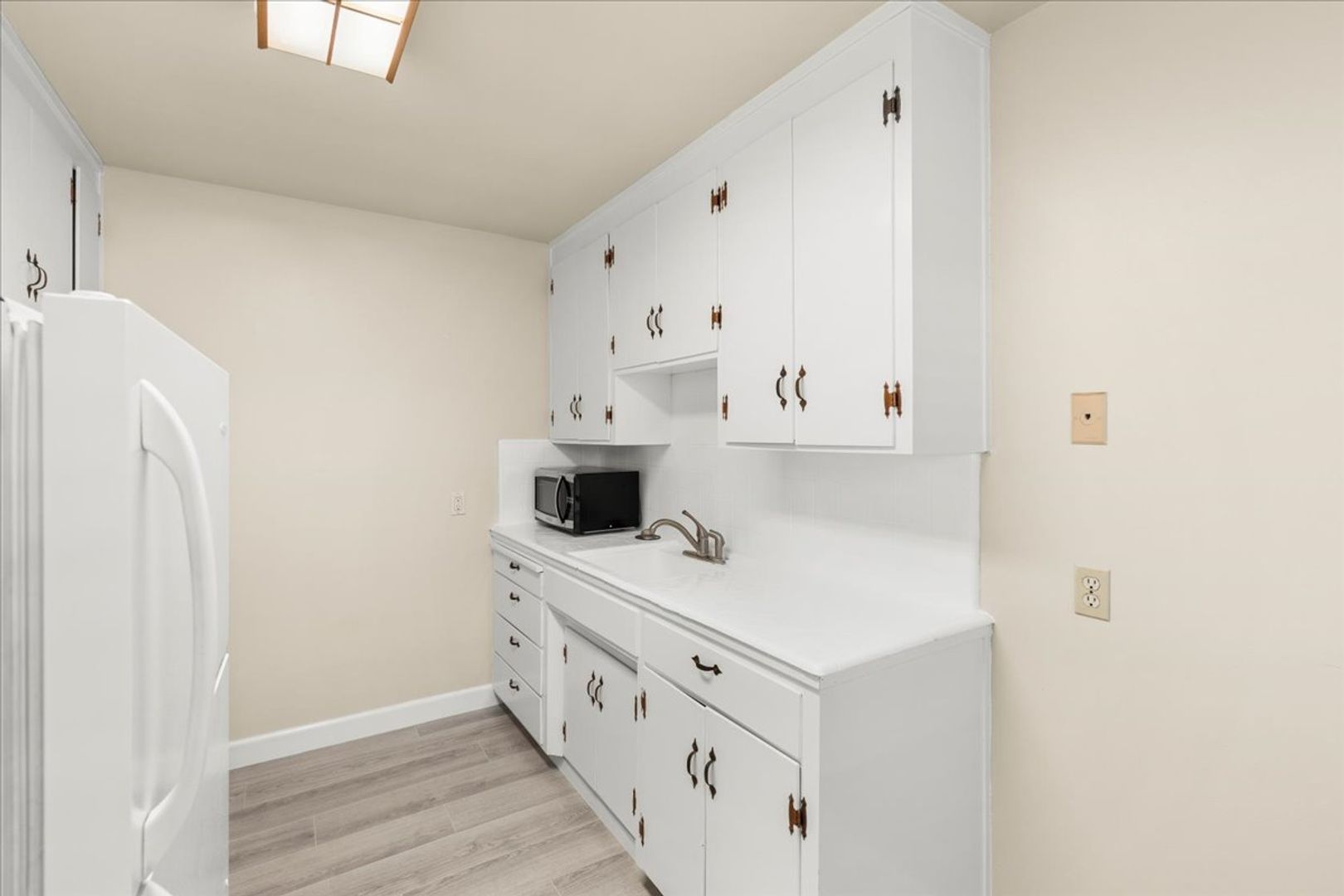 The kitchen has laminate flooring, refrigerator, electric stove/oven, microwave and lots of cabinets for storage.