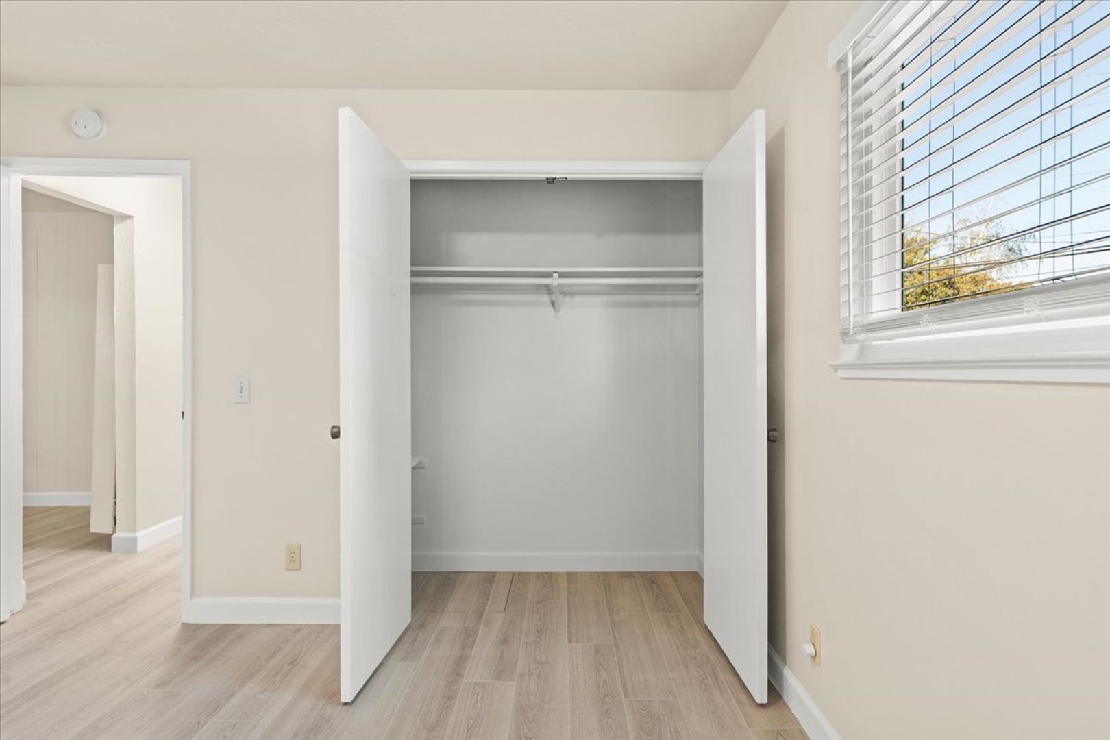 The hallway has built-in storage cabinets. The bedroom has a window with blinds and a closet.