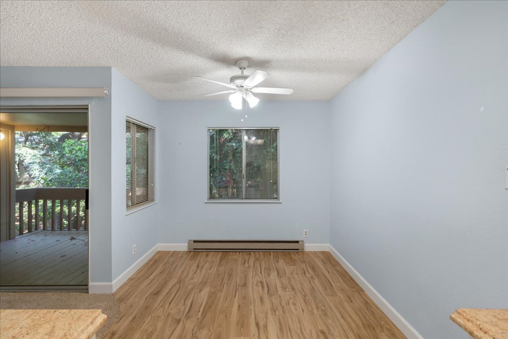 The separate dining area has a glass slider to the large private patio and storage closet.